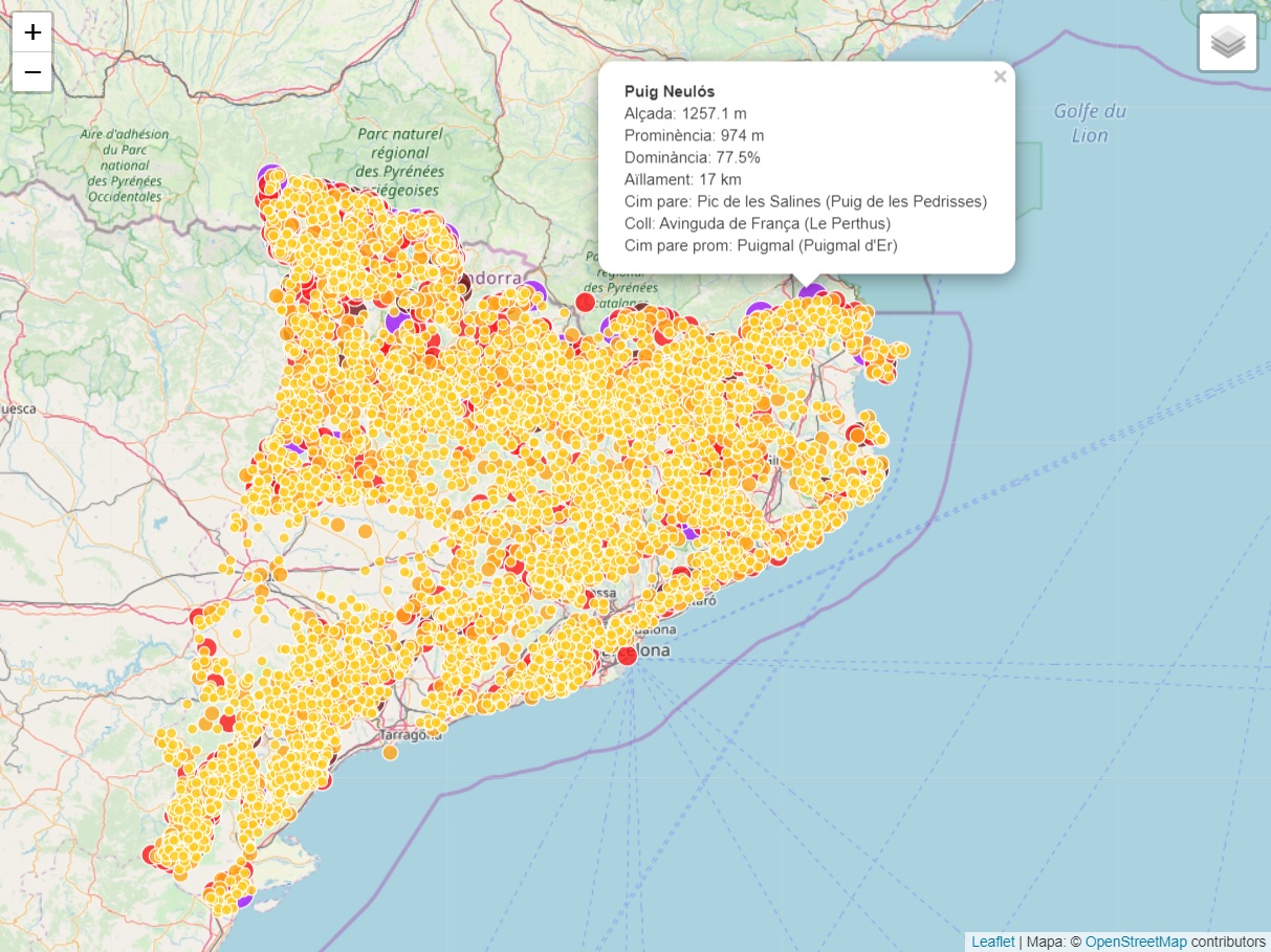 All the found peaks (prominence > 30m) and discussion of results are online at www.1001cims.cat. Unfortunately, the discussion text is only available in Catalan at the moment, although I guess automatic translation does a decent job for the interested reader. I will add an English translation some day.