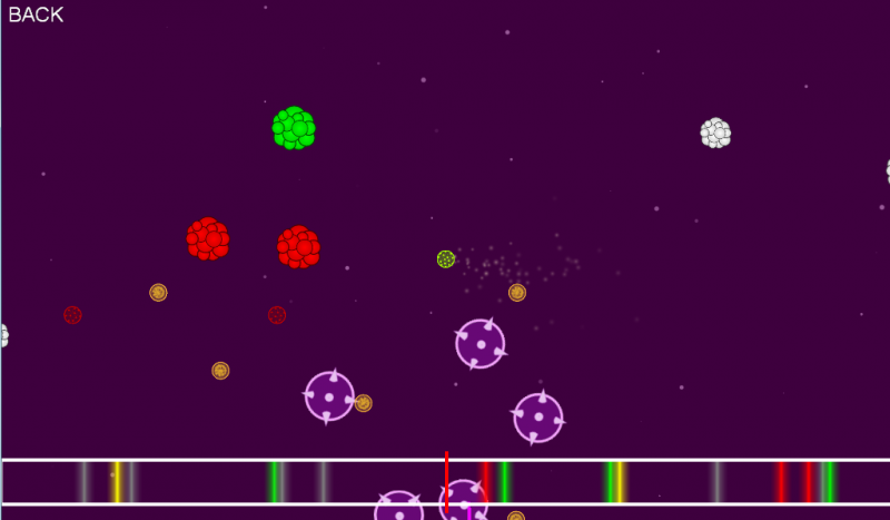 We created a gameplay that takes inspiration from Osmos combined with ideas from rhythm games. The goal is to conquer all the blobs in the scene. However, the player can only move when its color is active in the rhythm line. Every new blob converted to a player’s color will represent a new beat this player can use to move, since the angular position of each blob w.r.t. the center of the scene determines its timestep in the rhythm. The larger its army of blobs, the faster that player will be able to move.